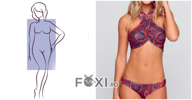 Cand umerii, talia si soldurile au aproape aceeasi dimensiune, obiectivul dvs. va fi sa creati forme cu ajutorul costumului de baie. Pentru a echilibra silueta, alegeti costume de baie cu bretele care se leaga in spatele gatului sau incrucisate in fata. Recomandarile specialistilor sunt modelele de costume dintr-o singura piesa cu modele care pun accentul pe talie. In partile inferioare va sugeram slipi clasici, cu volane si detalii care genereaza volum.
