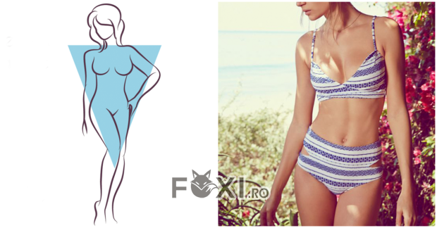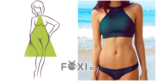 O silueta in forma de triunghi este mai proeminenta la solduri si mai ingusta la bust, astfel incat alegerea hainelor trebuie sa creeze un echilibru. Pentru femeile cu acest tip de corp sunt recomandate costume de baie dama cu bikini care au transparente sau expun partile laterale ale torsului. Acest lucru va face ca silueta dvs. sa iasa in evidenta daca combinati piese de diferite culori incercand sa utilizati tonuri intunecate in partea de jos. Culorile foarte vibrante si metalice nu sunt recomandate, deoarece acestea creeaza iluzia de mai mult volum. Daca corpul dvs. are aceasta forma, evitati slipul tanga sau brazilian, deoarece vor accentua mult mai mult soldul.