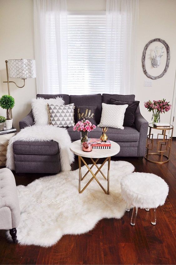 #71 Nu este necesar sa aveti mult spatiu pentru a obtine o camera de zi eleganta, uitati-va la aceasta fotografie. O canapea mica, o masuta de cafea minuscula, masute laterale, un covor plin care pare foarte pufos… Rezultatul este foarte atragator.